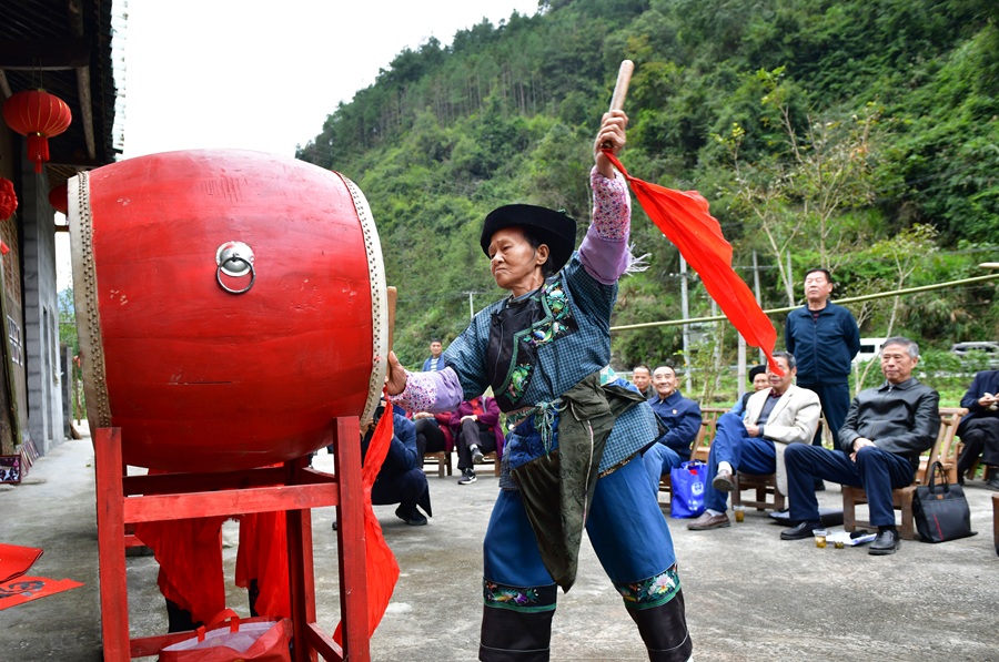 10月27日,吉首市矮寨镇排乃村, “五老”成员在表演苗族鼓舞。重阳节来临之际,该市关工委举行“情暖重阳,礼敬五老”主题活动,通过打苗鼓、唱苗歌、写书法、吟诗词等形式,为在关心下一代工作中散发光和热的“五老”们送上问候和祝福。姚方 杨燕萍 摄影报道