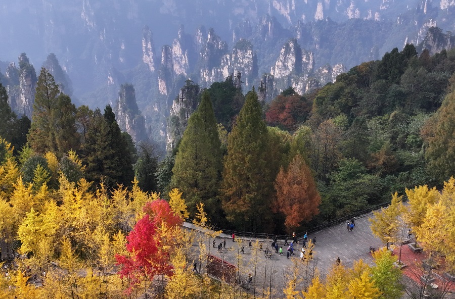 11月4日,张家界国家森林公园天子山景区,秋色斑斓,景美如画,吸引众多游客前来赏秋游玩。吴勇兵 摄