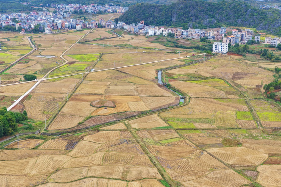 11月11日,嘉禾县广发镇白觉村,秋收过后,收割机在田间留下蜿蜒辙印,宛如大地“指纹”,与民居、公路、山峦相映成趣,构成了一幅田园立体画卷。黄春涛 摄