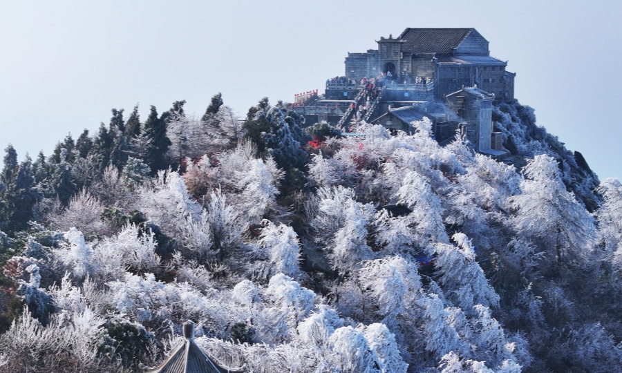 12月13日,南岳衡山迎来雪后雾凇奇观,银装素裹的林木晶莹剔透,吸引众多游客前来观赏。曹正平 文兰 摄影报道(湖南图片库)