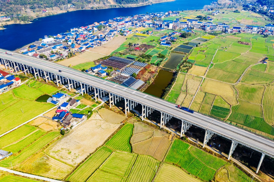 12月13日,包(头)茂(名)高速公路洪江市段与周边青山、田园、民居构成一幅和谐图景。近年来,当地持续加大公路建设力度,不断优化路网结构、提升路况质量,为群众铺就便民路、致富路、幸福路。 石猛雷 摄(湖南图片库)