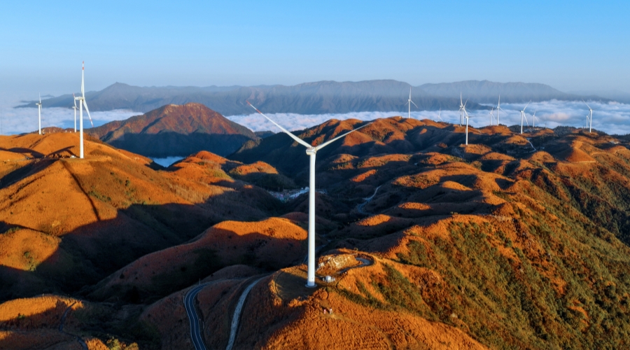 12月17日清晨,桂东县万洋山,旭日映照下,风力发电机与云海、蓝天相映成趣,构成自然与现代交融的冬日晨景。 邓仁湘 摄(湖南图片库)