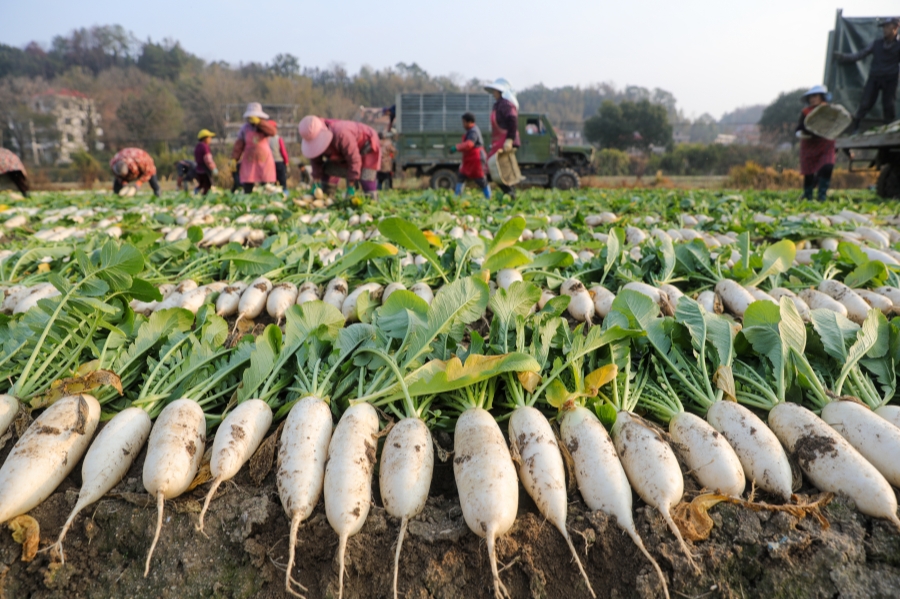 12月18日,衡阳县关市镇鑫粤农业生态蔬菜种植基地,村民在采收白萝卜。刘欣荣 摄(湖南图片库)