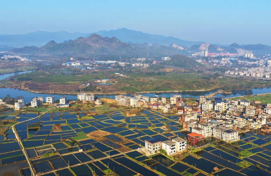 1月8日,嘉禾县珠泉镇井涵村,鱼塘星罗棋布,与民居、河流、公路交相辉映,构成一幅产业兴、生态美、百姓富的乡村振兴新图景。近年来,当地依托丰富的水资源,大力发展生态渔业养殖,带动村民增收。 黄春涛 摄(湖南图片库)