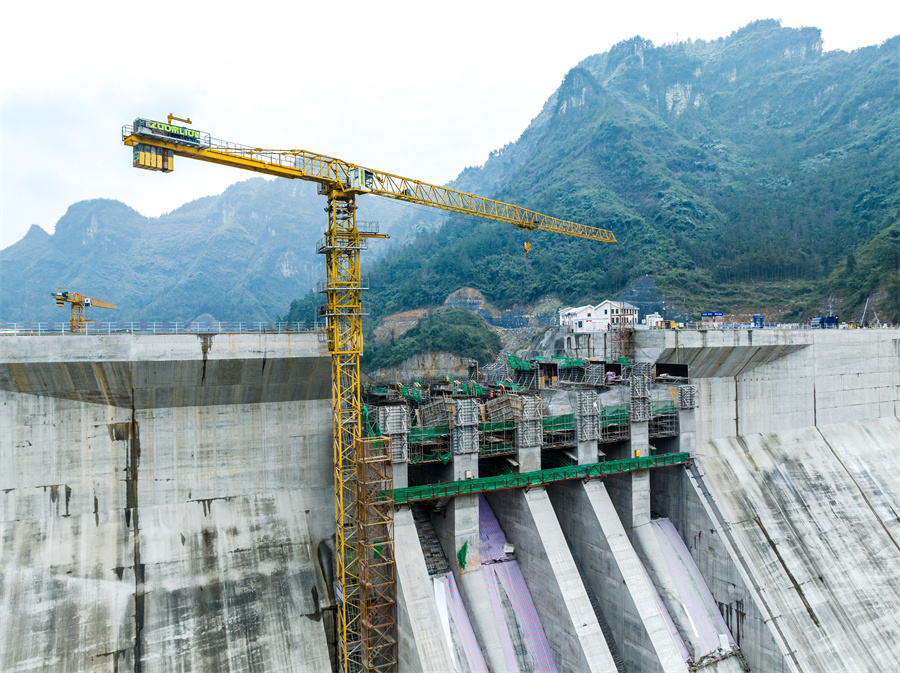 1月22日,吉首市矮寨镇大兴寨水库工程建设现场,工人在进行溢流坝段浇筑作业。面对近期低温雨雪冰冻天气,建设单位采取保温措施并优化施工安排,确保工程按计划推进。彭璟 摄(湖南图片库)