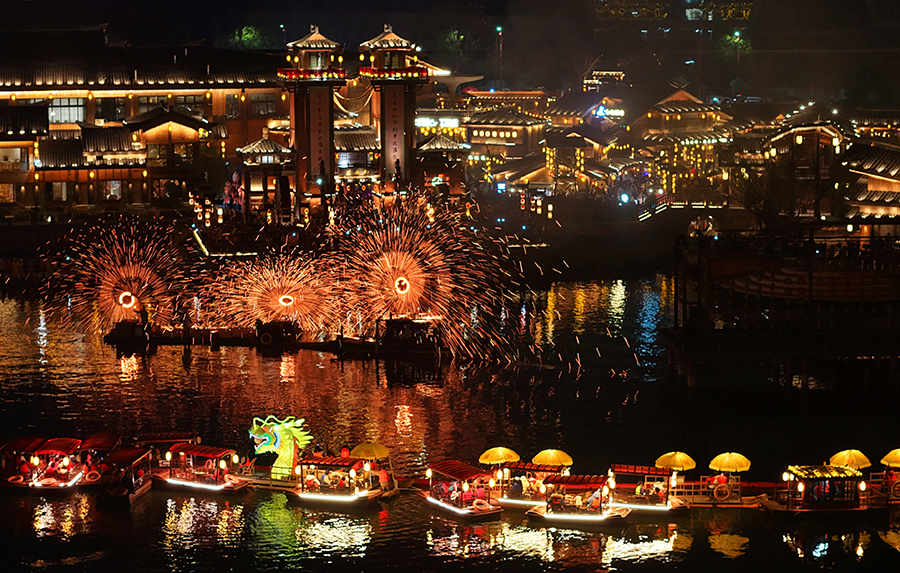2月1日晚,衡阳市南岳区南岳里庙会美食文化街区,打铁花表演精彩纷呈。春节临近,南岳区推出丰富多彩的非遗、民俗展演,展示中华优秀传统文化,营造喜庆节日氛围。 曹正平 文兰 摄影报道(湖南图片库)