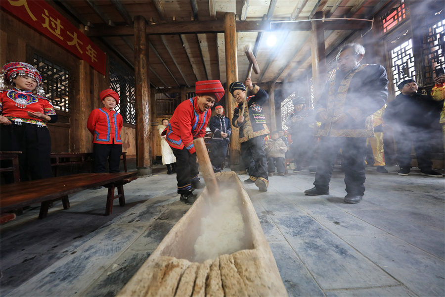 2月9日,龙山县召市镇神州社区马洛沟村,村民在打糍粑。曾祥辉 摄(湖南图片库)