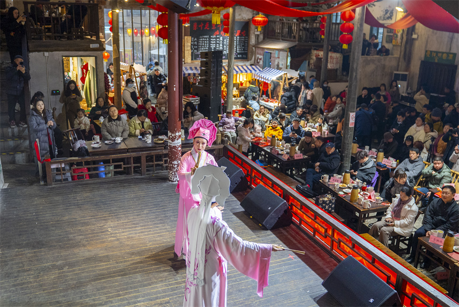 2月9日,长沙市东茅街茶馆,演员在表演节目《十八相送》。湖南日报全媒体记者 童臻熙 摄