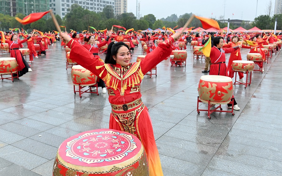 2月10日,洞口县人民广场,群众在击鼓祈福迎新春。当天,该县举办迎新春群众文化活动,人们敲锣打鼓、舞龙舞狮、载歌载舞,营造热闹喜庆的节日气氛。滕治中 滕绍忻 摄影报道