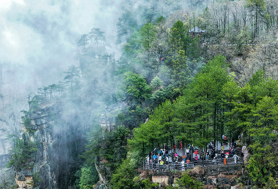 3月30日,张家界国家森林公园天子山景区出现云海奇观。连绵春雨中,三千奇峰被缥缈云雾环绕,宛若水墨丹青,吸引众多游客前来观赏。 吴勇兵 廖颂怡 摄影报道(湖南图片库)