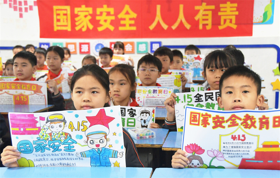 4月14日,江永县思源实验学校,学生在展示“全民国家安全教育日”主题手抄报。田如瑞 摄(湖南图片库)