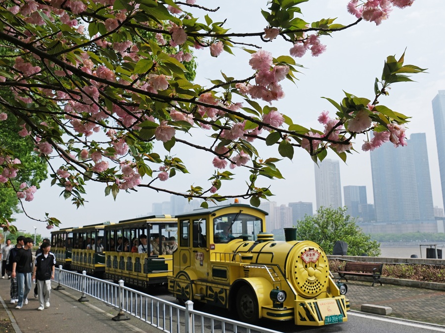 4月17日,游客乘坐小火车在观光游览。当前,长沙橘子洲景区春意正浓,满目新绿,吸引众多游客前来踏青游玩,尽享春日美好时光。林道辉 摄