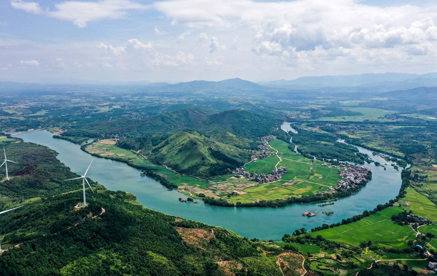 8月25日,道县蚣坝镇境内,潇水河蜿蜒流淌与青山、田野相映成趣,构成了一幅“水清、岸绿、景美”的画卷。