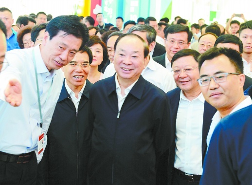 5月10日上午,第十四届中国(深圳)国际文化产业博览交易会在深圳会展中心开幕。中共中央政治局委员、中宣部部长黄坤明(中)来到湖南馆,听取了湖南文化创意产业发展情况介绍,肯定湖南文化改革发展取得的成绩。湖南日报记者 徐行 摄