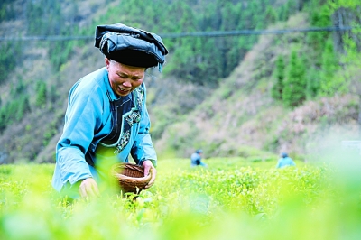 湘西州保靖县枫香村村民在采摘茶叶。光明图片/视觉中国