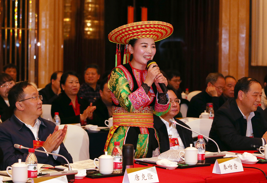 “怀邵衡铁路建成通车,结束了邵阳西部洞口县、隆回县无铁路的历史。”带来好消息的,还有来自隆回县虎形山瑶族乡的少数民族代表奉吻香,她说,在各级党委政府和相关部门的努力下,她的家乡花瑶发生了翻天覆地的变化,瑶王古寨基本建成。“我代表我的父老乡亲们,诚挚地邀请省长来‘梦中的花瑶’做客。”发言结束后,奉吻香用一首花瑶山歌,向省委、省政府对瑶乡发展的关心和支持表示感谢。许达哲说,去年,我们借助省级媒体的力量,做了“百里脐橙连崀山”的宣传推介,用文化的力量帮助果农们实现了增收。今年,我们要继续延续好这个有效举措,策划“梦里瑶乡等你来”,助力瑶乡文化旅游大放异彩。