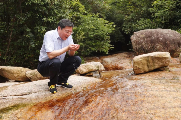 2018年6月29日,杜家毫登上蓝山县野狗岭,考察湘江源的生态环境保护,他俯身捧起清洌甘甜的源头活水,一连喝下三大口。