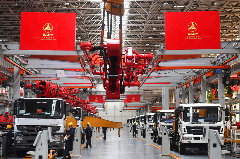 8月10日,记者来到长沙经济技术开发区三一工业城,印有“SANY”字样的混凝土机械、路面机械、港口机械,正源源不断地从18号厂房下线。