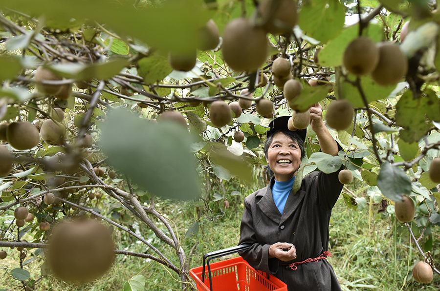 9月28日,蓝山县所城镇联云村,村民在采摘晚熟猕猴桃。当天,该县举行第二届猕猴桃采摘节。近年,该县利用山地资源发展猕猴桃等特色水果种植,带动贫困户入股分红和就近务工增收。目前,全县种植猕猴桃1000余亩,带动了200多户贫困户增收脱贫。