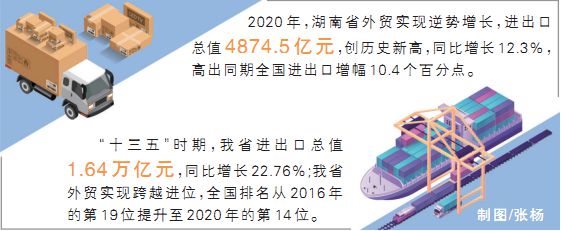 2020年,湖南省外贸实现逆势增长,进出口总值4874.5亿元,创历史新高;总量排名全国第14位,较2019年前进1位;同比增长12.3%,高出同期全国进出口增幅10.4个百分点。其中,第四季度外贸发展明显提速,增长31.2%。另据长沙海关统计,“十三五”时期,我省外贸实现跨越进位,全国排名从2016年的第19位提升至2020年的第14位。