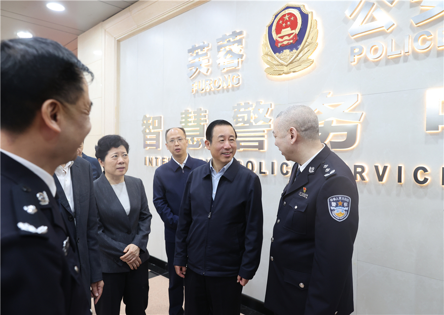 4月21日上午,省委书记、省人大常委会主任、省政法队伍教育整顿领导小组组长许达哲在长沙检查政法队伍教育整顿工作。图为许达哲考察芙蓉公安分局智慧警务中心。