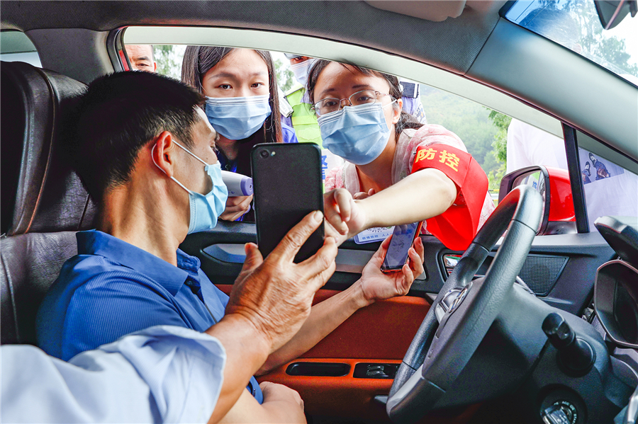 8月4日,岳临高速楚江收费站,防疫人员在查验旅客的健康码、行程码。