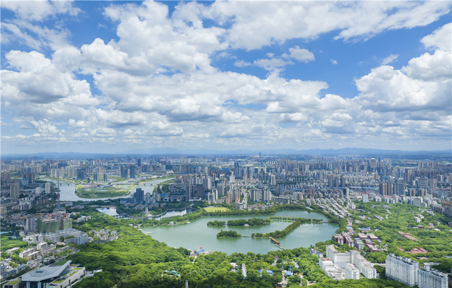 8月5日,长沙。蓝天碧水与城市建筑相得益彰,绘就一幅秀美的生态画卷。 湖南日报全媒体记者 李健 摄