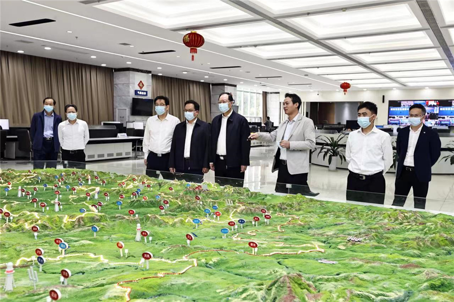 毛伟明通过沙盘了解全省气候环境和气象趋势情况。以上照片均由湖南日报全媒体记者 刘尚文 摄