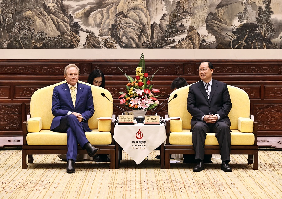 3月23日中午,省委副书记、省长毛伟明在长沙会见澳大利亚FMG集团创始人兼董事长安德鲁·福瑞斯特博士一行。