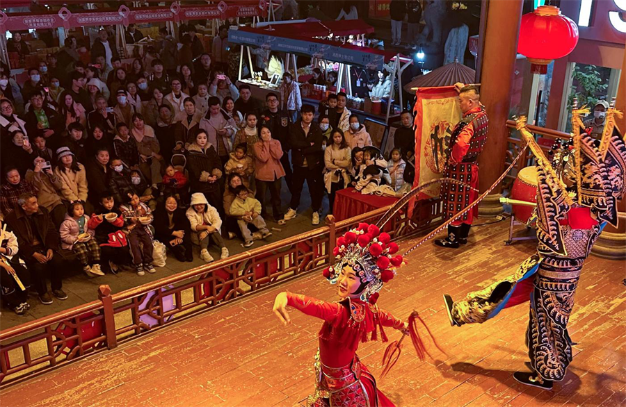 2023年12月30日晚,长沙坡子街火宫殿,传统戏曲表演吸引了众多市民游客。