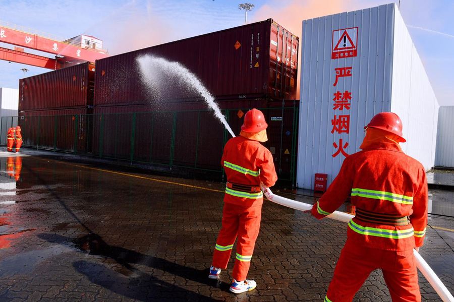 长沙集星集装箱码头举行针对堆场发生燃爆事故的消防应急救援演练。