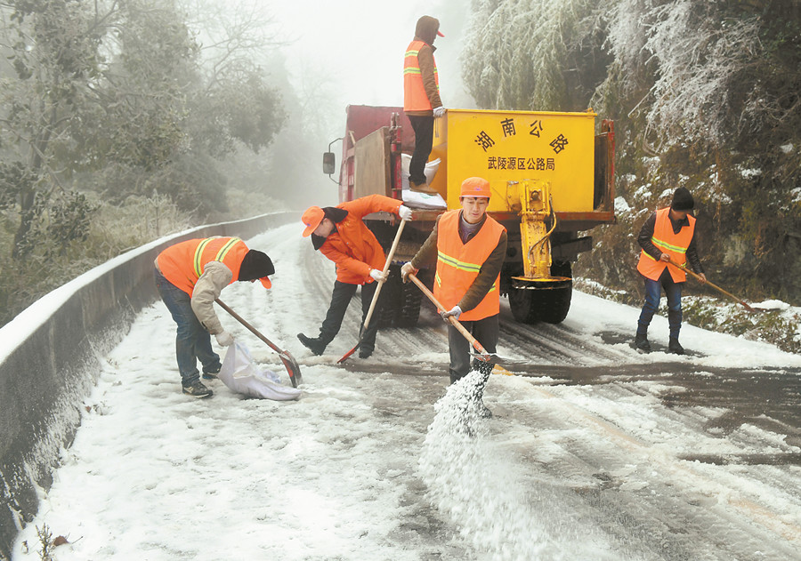 1月6日,张家界武陵源区龚张公路,工作人员在撒盐融雪。当天,受较强冷空气影响,武陵源景区的部分道路出现结冰现象。武陵源区公路局迅速启动应急预案,组织工作人员对结冰路段开展铲雪保畅通工作,确保景区旅游道路安全畅通。