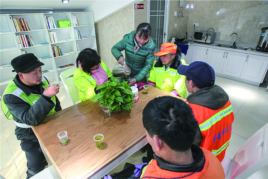 图为栖凤路月岛社区公园广场入口处的“城市驿站”内,一名值守人员为环卫工人倒茶(新华社 图)。