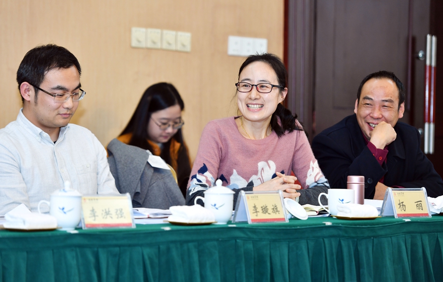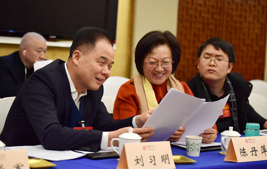1月26日,在政府工作报告小组讨论会上,刘习明委员(左)和陈丹萍委员(中)在休会间隙热烈讨论。 湖南日报记者 郭立亮 摄