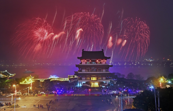 2月15日晚,华美、绚丽的焰火给星城增添了节日的喜庆。当晚是万家团圆的除夕夜,主题为《玉犬迎新年》的焰火晚会在长沙市橘子洲举行,为市民送上一道迎春纳福的视觉大餐。