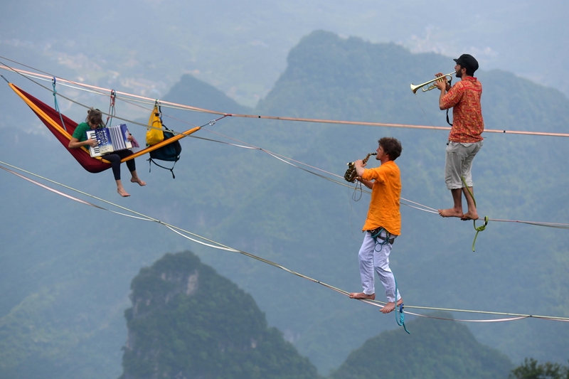5月25日,张家界天门山景区,高空扁带乐队Houle Douce成员在高空扁带上演奏乐曲。当天,张家界天门山举行高空走扁带音乐会,乐队成员在天门洞前方几百米高的空中,以扁带和织网为舞台,将极限运动与音乐艺术结合在一起,在云端上演了一场惊险、浪漫的空中音乐会。