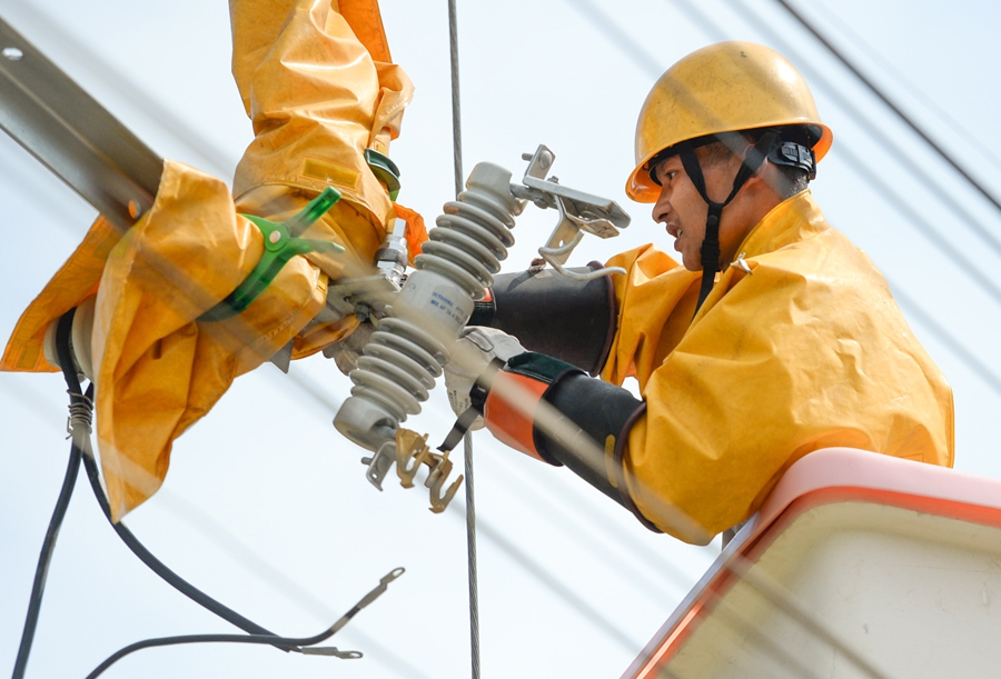6月29日,长沙市岳麓区王家湾,国网长沙供电公司带电作业班的工作人员在进行配电故障紧急抢修。近日,持续高温天气导致用电负荷猛增,带电抢修工作人员的工作任务增加至平时的3至4倍,他们不惧炎热,坚守岗位,保证居民清凉度夏。