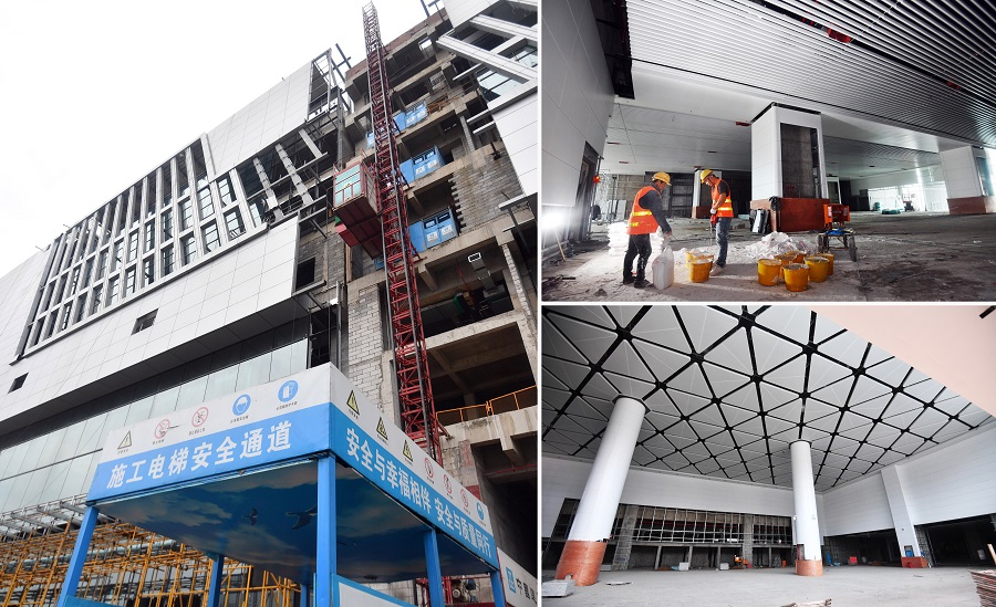 5月6日,长沙汽车南站综合交通枢纽项目工地,正在进行外部装修的主站房(图①)以及装修基本完工的候车厅(图②)和售票大厅(图③)。该项目按国家一级客运站标准规划、建设、运营,总用地217亩,于2015年11月底动工。目前,包括主站房、备班楼、到站楼在内的主体工程已完工,正在全力推进内外部装修。预计下半年竣工并投入试运营。湖南日报记者 田超 摄
