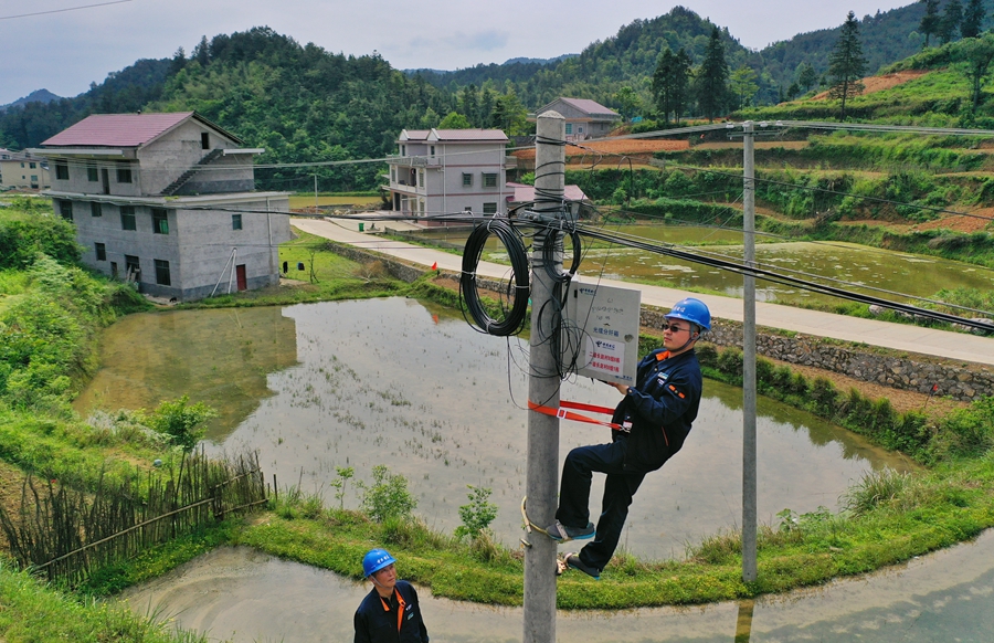 5月9日,安化县乐安镇长赵村,中国电信益阳分公司员工在对电信光纤分线箱进行装线与维修。去年10月,中国电信益阳分公司为该村开通光纤网络、建成4G基站,并帮助合作社、村民进行网络农产品销售。至今,该村各合作社通过网络销售雪莲果、红皮小籽花生等特色农产品的收入超过50万元。 湖南日报记者 傅聪 摄