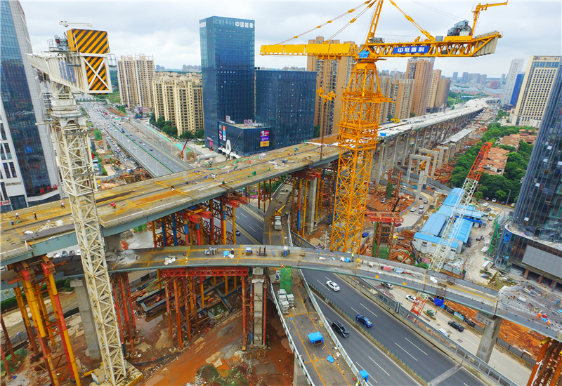 6月9日,长沙市湘府路快速化改造工程跨万家丽路高架主线桥施工现场,施工人员放弃端午假日休息,加班加点抢抓施工进度。目前,湘府路快速化改造工程京港澳高速以西段主线已全线贯通。预计本月底,湘府路快改花侯路以西段主线桥梁可具备通车条件,9月底全线达到通车条件。湖南日报记者 田超 摄