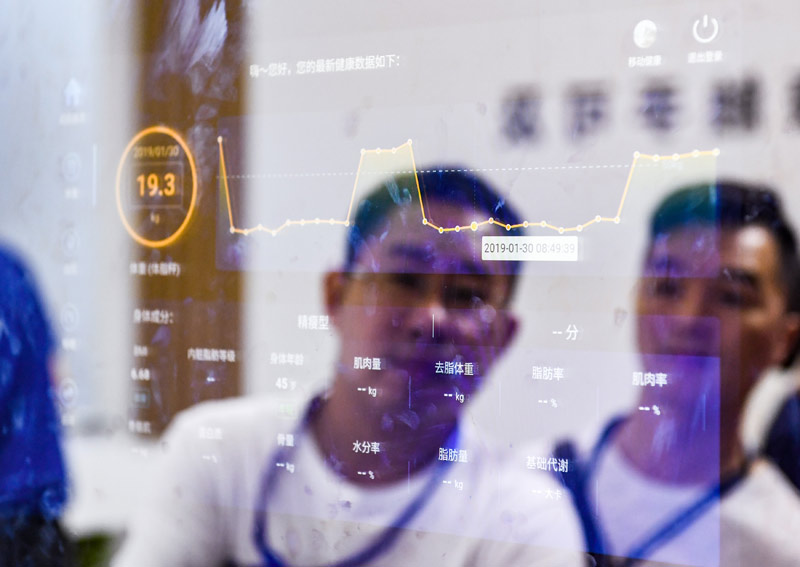 在广东深圳会展中心举办的第七届中国电子信息博览会(CITE2019)上,观众在京东方展台了解智能镜子(4月9日摄)。新华社记者 毛思倩 摄