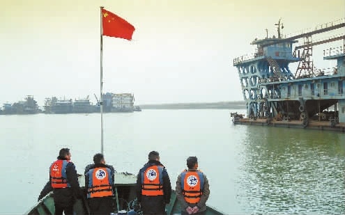 中午时分,船行至东洞庭湖南套船坞码头至六门闸水域湖洲沿线,大大小小的采砂船整齐有序停泊在岸边,岳阳县砂石办一大队副大队长胡勇带着6名执法人员驾船在此巡查。“今天共有69艘采砂船在此停靠,暂时未发现违反规定的情况。”胡勇称,“洞庭湖区每个涉砂县(市、区)都有集中停靠点。作为湖区涉砂规模最大的县,岳阳县去年初就出台相关规定,实施停采整顿。县砂石办一大队负责巡逻值守,打击盗采;二大队负责执法办案,过年也会轮流值班,24小时保洞庭湖的安宁。”