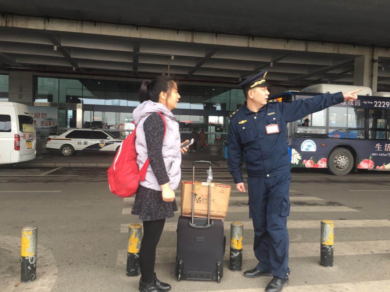 2月15日(除夕),株洲市交通行政执法监督处的执法人员为旅客指路。