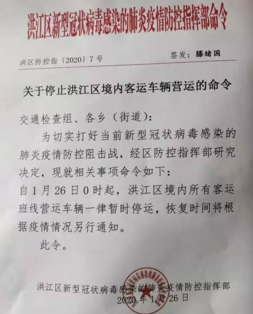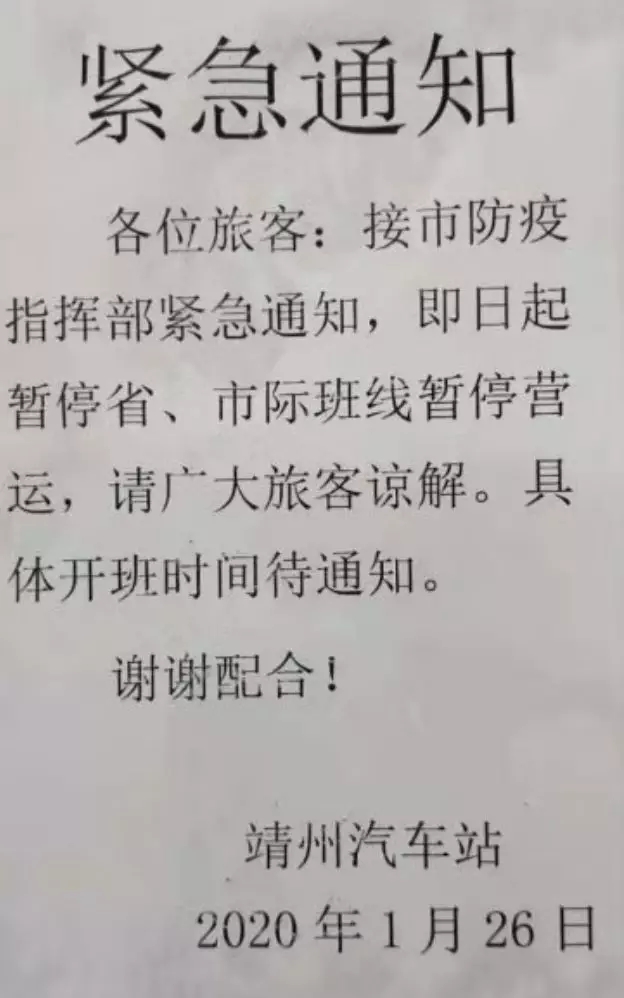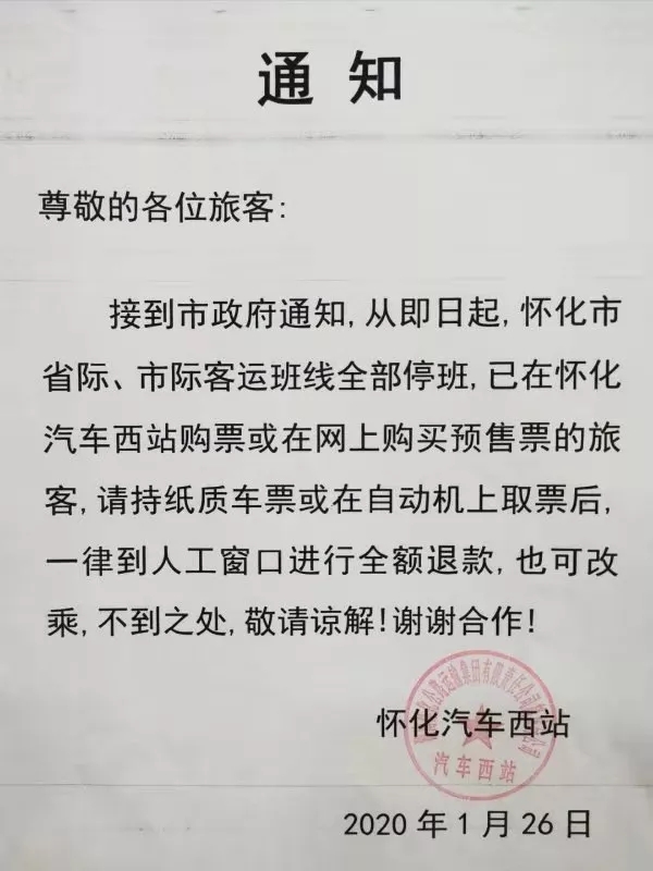 从怀化市新型冠状病毒感染的肺炎疫情防控指挥部获悉,1月26日起,怀化市已经暂停了部分省际道路客运班线营运,为严控新型冠状病毒通过道路客运传播,根据《怀化市关于有效防控新型肺炎疫情的十条禁令!》,1月27日起全面暂停全市省际、市际客运班线营运。各县市区公交车暂时停运。