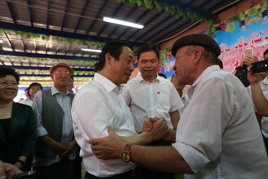 在吐鲁番市高昌区,代表团先后前往湖南援建的葡萄沟街道青蛙巷“文化大院”、亚尔镇亚尔村坎儿井特色小镇项目,考察文化旅游产业发展、文化阵地建设等情况。亚尔村村民外力·吐尔逊告诉许达哲,湖南援疆干部帮村里做规划、引资金,还带着不少村民开起了家庭客栈,生意很火爆,“大家都夸湖南亲人亚克西!”许达哲说,大家日子越来越红火,是以习近平同志为核心的党中央的治疆方略“亚克西”,大家一定要听党话、感党恩、跟党走。