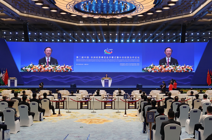 杨洁篪表示,中非经贸博览会已成为推动中非合作论坛经贸举措落实的新平台和地方对非经贸合作的新窗口。中方将继续坚定不移支持非洲联合自强,支持非洲国家经济社会发展,同非洲国家加强战略对接,携手抗疫,深化经贸、互联互通、绿色发展、人力资源开发等各领域务实合作,助力非洲国家提升自主发展能力、产业发展水平、一体化进程和抗击疫情能力,不断增进中非人民福祉。
