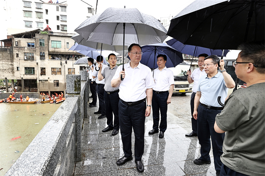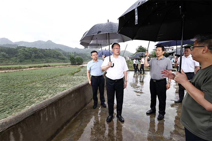 7月3日,省委副书记、省长毛伟明在怀化市辰溪县修溪镇征溪口村检查指导防汛抗灾工作。