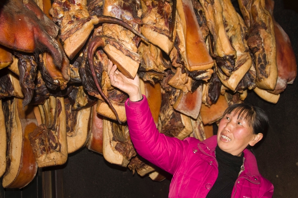 刘焕香将大家引进屋内。厨房灶台上方,挂满了腊肉。刘焕香解释:“腊肉比较畅销,索性将几头年猪全部宰杀腌制了,用柴火一熏,这些猪肉可赚1万多元。”