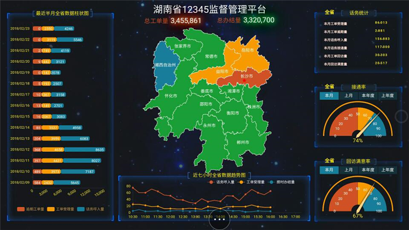 为落实省长许达哲2018年1月2日调研“互联网+政务服务”、12345政府服务热线监督平台等工作时的指示精神,利用1个多月的时间,截至2月11日,省政府办公厅建设的“湖南省12345监督管理平台”实现与13个市12345政府服务热线平台全对接(湘西自治州还未建有12345政府服务热线平台)。该平台能实现实时监测、智能督办、绩效考核、大数据分析和决策支撑,加强对各级12345政府服务热线平台运行的监督,督促各级各有关部门及时认真处理群众通过12345热线反映的诉求;通过大数据分析处理,为领导决策提供参考依据。