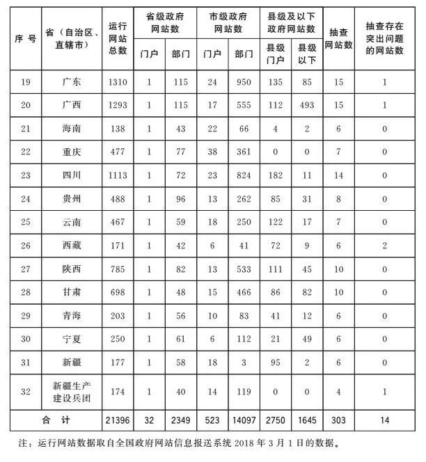 为深入贯彻习近平新时代中国特色社会主义思想和党的十九大精神,落实《国务院办公厅关于印发政府网站发展指引的通知》(国办发〔2017〕47号,以下简称《指引》),推动各级政府网站运用信息化手段方便企业群众办事、回应社会关切、构建一体化在线服务平台,按照工作安排,国务院办公厅政府信息与政务公开办公室(以下简称国办信息公开办)近期组织开展了2018年第一季度全国政府网站抽查。现将有关情况通报如下: